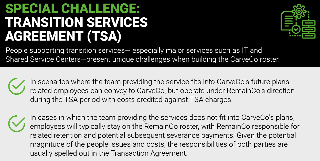 In large, less entangled operational functions, such as R&D/Engineering and Customer Service, frontline staff may clearly align with CarveCo based on product alignment or similar criteria. Within those same functions, however, there may be highly entangled sub-groups (e.g., functional standards, testing, training), and it may not be feasible to agree on specific staff names prior to deal signing. In these cases, the key principles should be codified in the transaction agreements, including a fair share of talent, target numbers of staff, percentages of mid- and senior-management levels, and average costs.