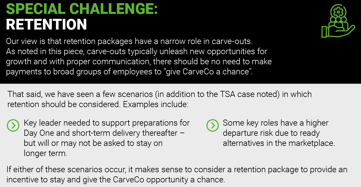 In a recent carve-out of a set of legacy products, many employees were concerned that CarveCo would not have the “legs” to survive in the long term and were informally lobbying not to be offered roles there. After multiple town hall discussions with the new CEO – someone who was well known within RemainCo – and positive impressions of other leaders appointed to the Executive team, these concerns were alleviated, and the hallway discussions shifted to the opportunity to grow/take on new challenges at CarveCo.