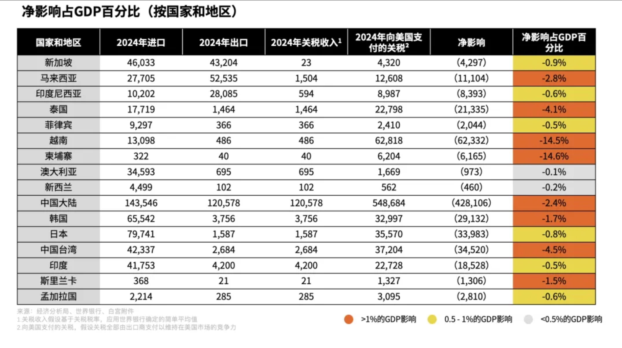 通过对近期政策变化的分析,我们发现,亚太一些国家和地区受到的不利影响远比其他国家和地区严重。这是由于对各个国家和地区实施的具体关税税率不同、对向美出口的依赖程度也不同。