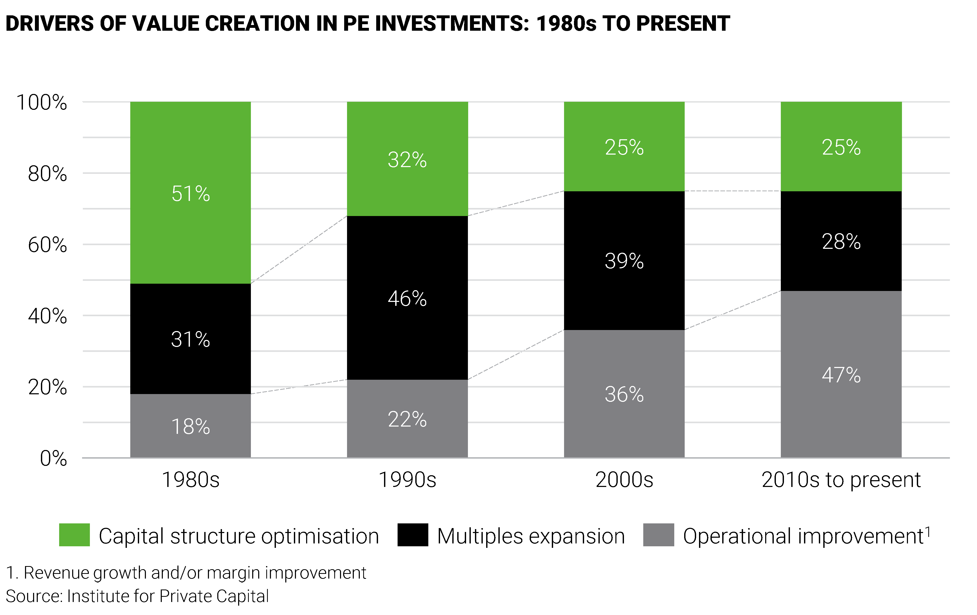 Growth and margin improvement through operational improvement now represent nearly half of all PE value creation, a 2.5-fold increase over the last three decades. Consequently, value creation levers are instrumental at every stage of the investment cycle. For that, GPs need a robust equity story backed by a clear value creation thesis, which increasingly comprises a sizeable operational dimension. The ability to execute these complex, operationally focused plans has now become pivotal.