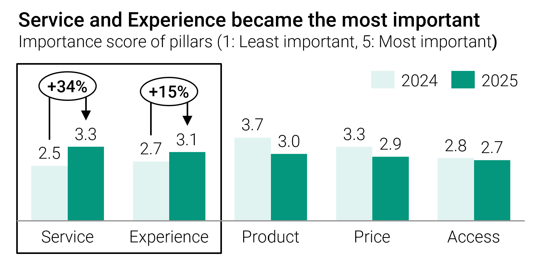 Service and experience have jumped in importance, while price has dropped—but it’s not that simple. Brand connection is outshining discounts and value is being redefined as consumers prioritize ease, convenience, access, and trust.