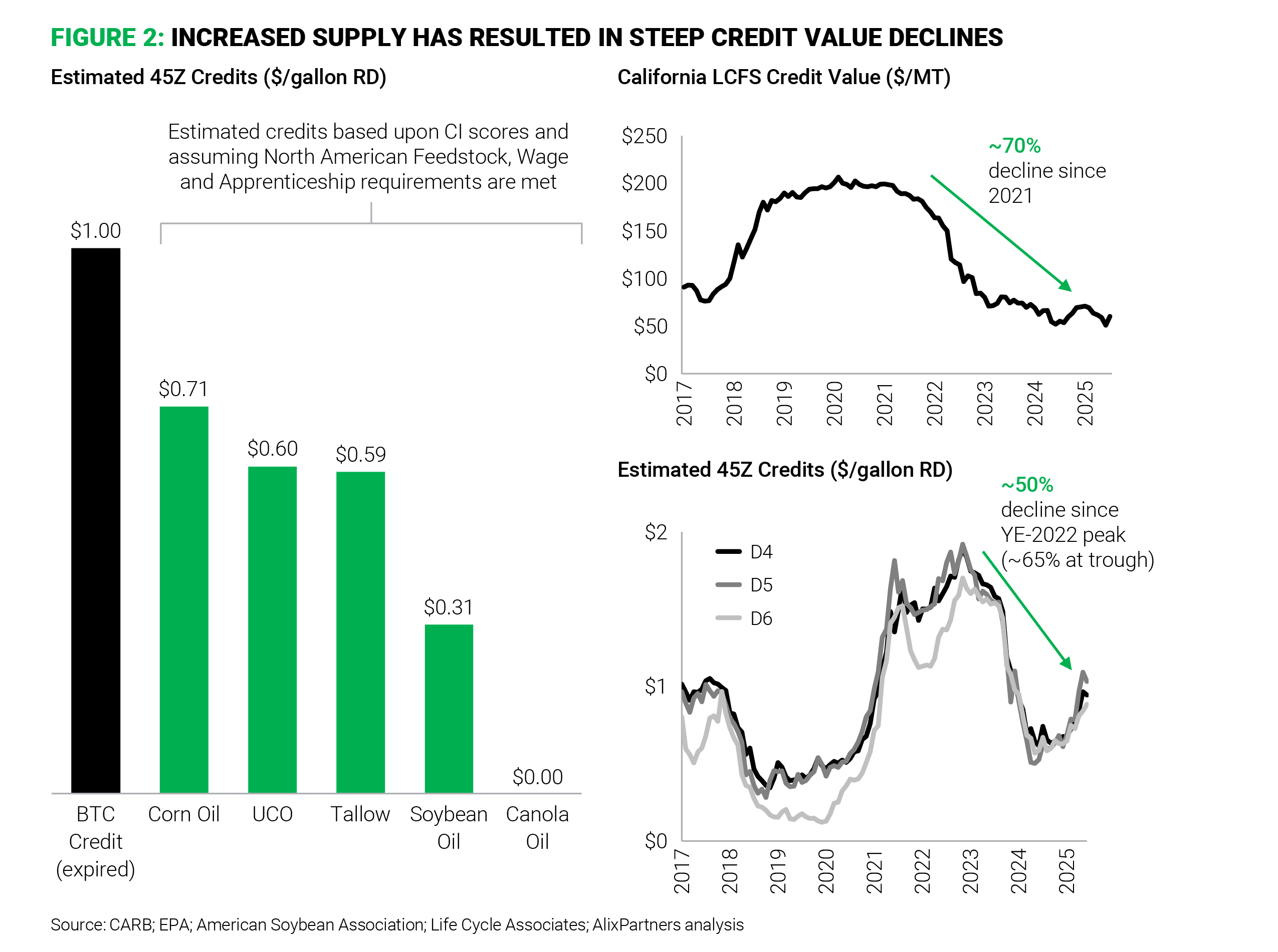 However, policy and market pressures have quickly shifted dynamics. Congress allowed the $1-a-gallon Biodiesel Blenders’ Tax Credit to expire in December 2024 and replaced it with a new 45Z Clean Fuel Production Tax Credit that offers much less value. At the same time, federal market-based incentives (RINs) and state-based credit values have declined steeply from the highs of just a few years ago, due to the surplus in supply.