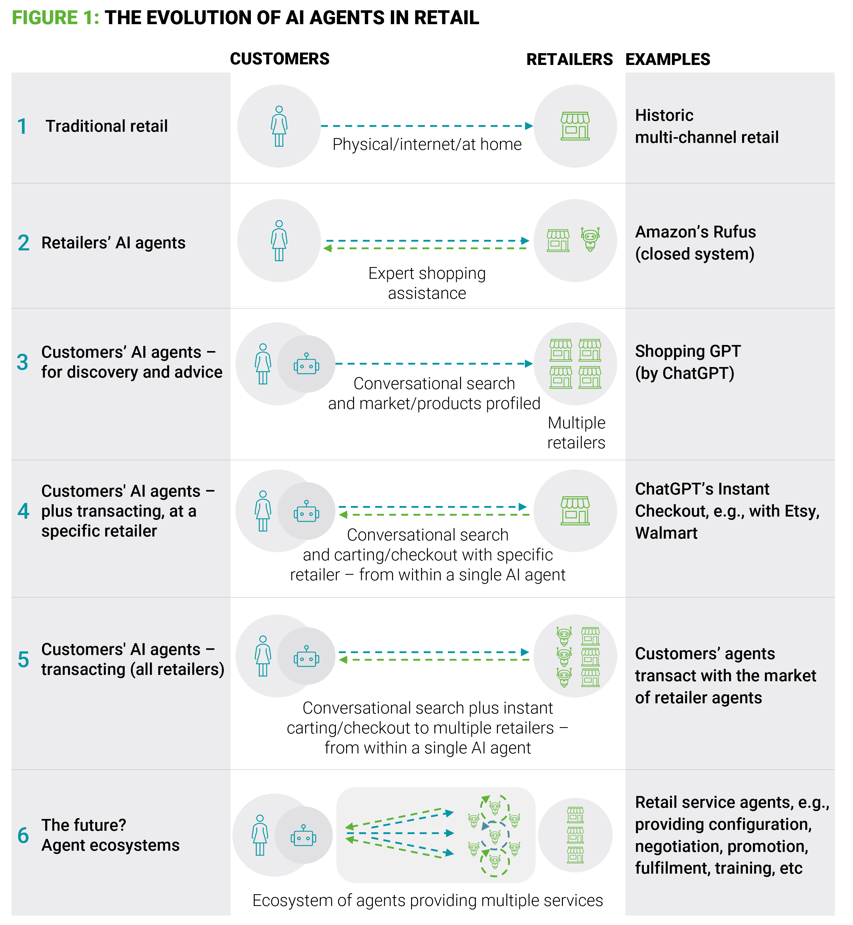Two distinct types of agents are now emerging: customer-facing agents – where customers use tools like ChatGPT or Google Gemini to search, compare, and purchase products – and retailer-owned agents, such as Amazon’s Rufus, which operate within retailers’ own ecosystems to improve product discovery, service, and conversion. Over time, these two types will increasingly interact, with customer agents surfacing structured product data provided by retailer agents, comparing images, features, prices, and availability, and potentially negotiating prices or delivery windows in the near future. The future of commerce will increasingly be defined by how these agents communicate and transact across this new, AI-mediated channel.