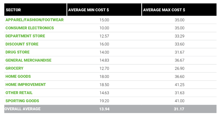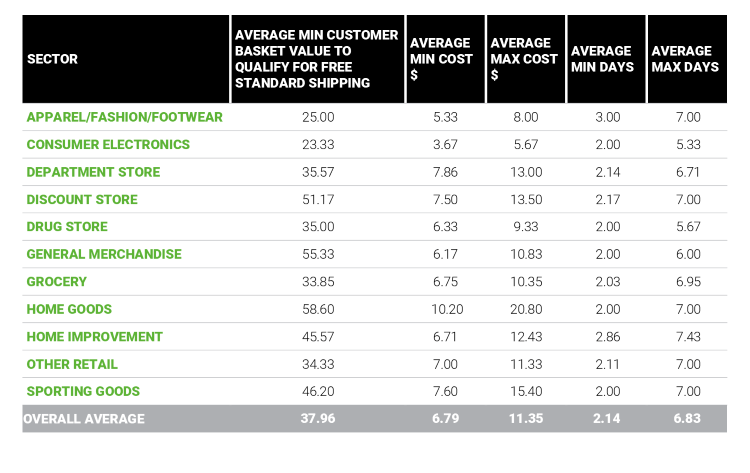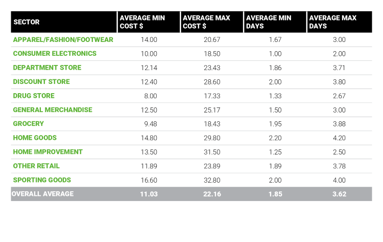When shoppers aren’t content to wait for standard shipping, expedited shipping, offered by all but 8 in our top 100 data set, is the next option. The average minimum number of days across this set of retailers is 1.8 days, and the average maximum is 3.6. On the cost side, the average minimum charge for expedited shipping is $11.03, and the average maximum charge is $22.16.