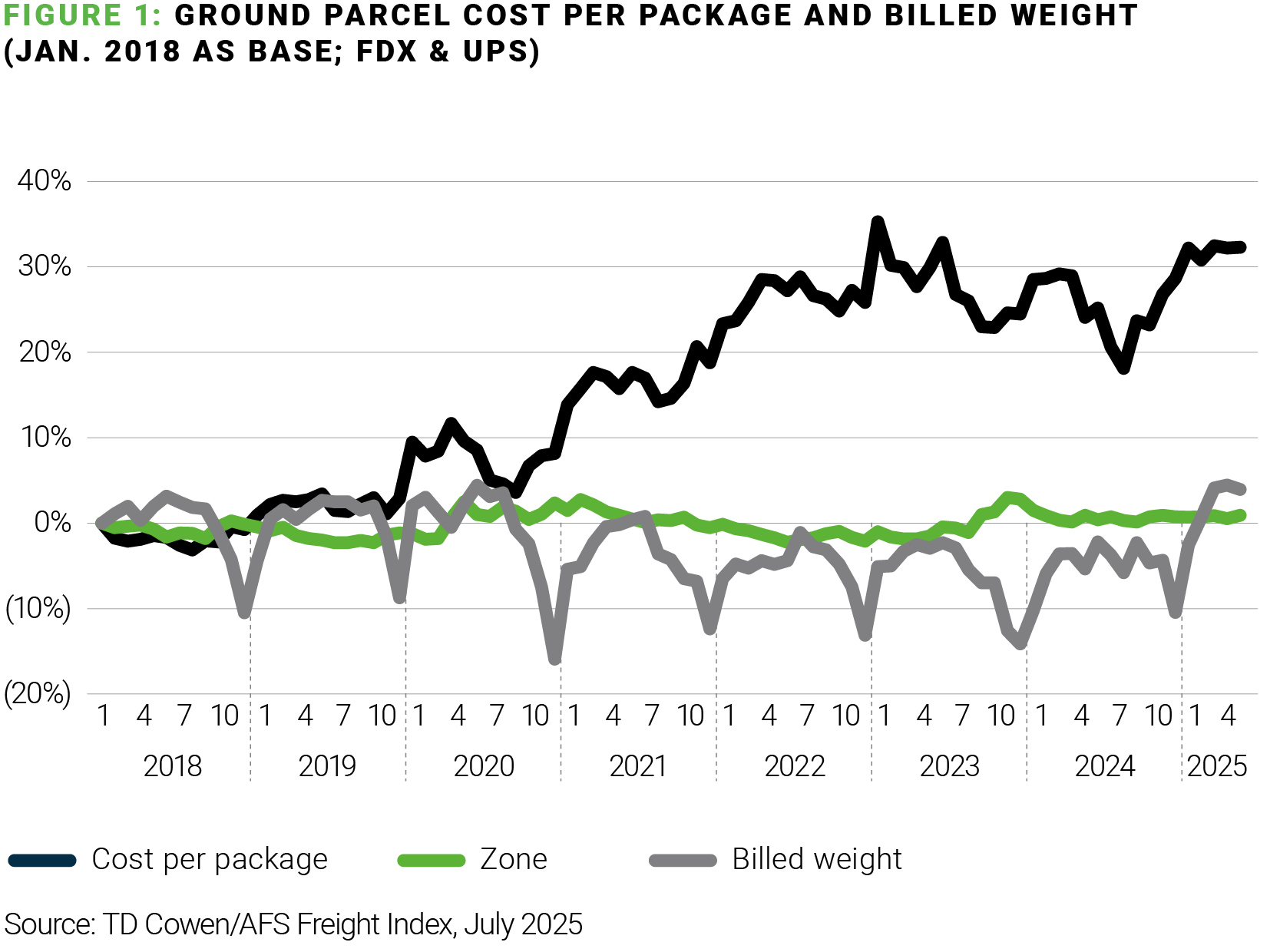 Besides the peak surcharge, many shippers have seen small parcel delivery costs continue to climb. In Q2 2025, the average ground parcel cost per package was reported at its highest level in recent years. This increase occurred despite competitive discounts extended by UPS and FedEx to large accounts, reflecting the carriers’ broader use of surcharges, fees, and structural adjustments that affect overall cost profiles.