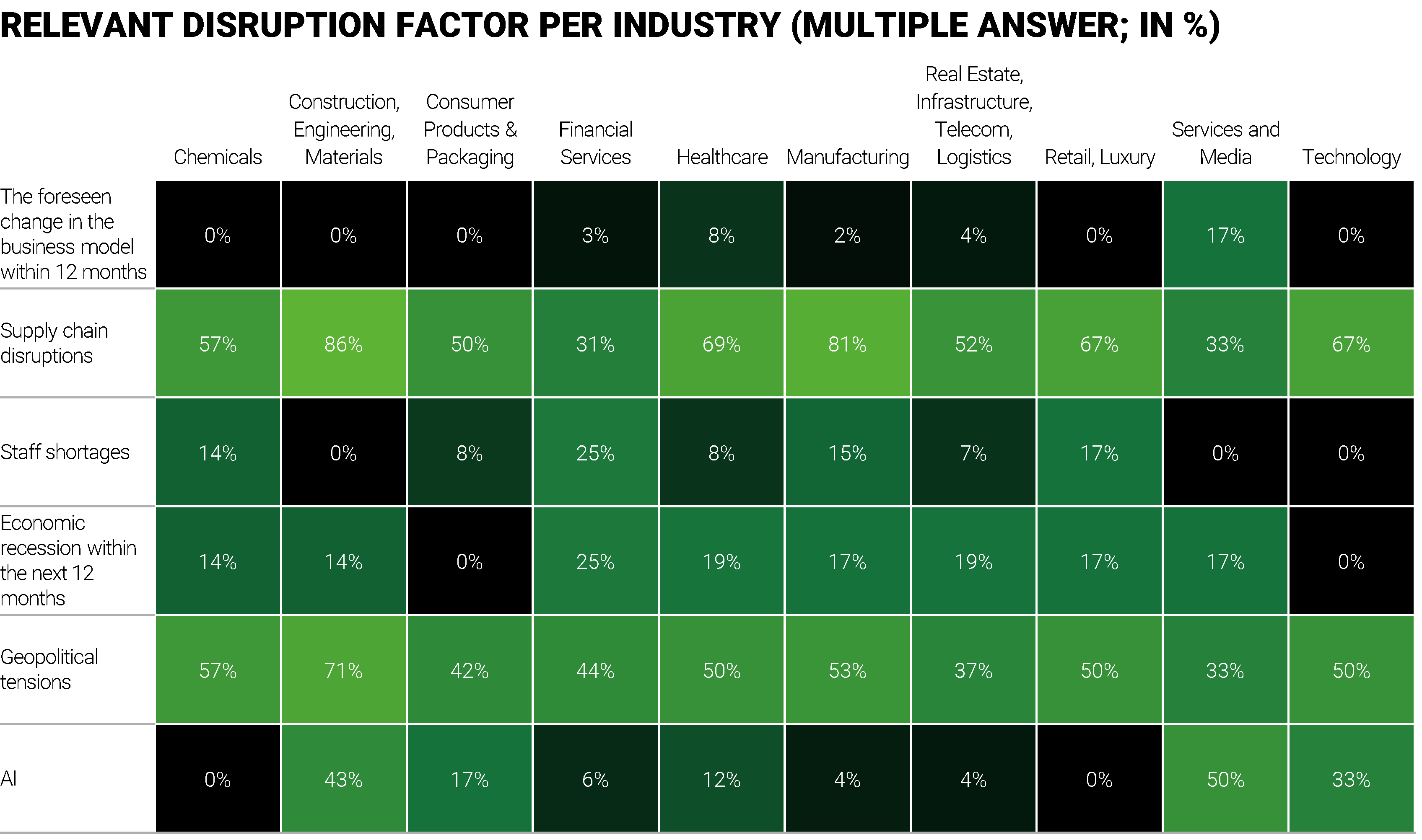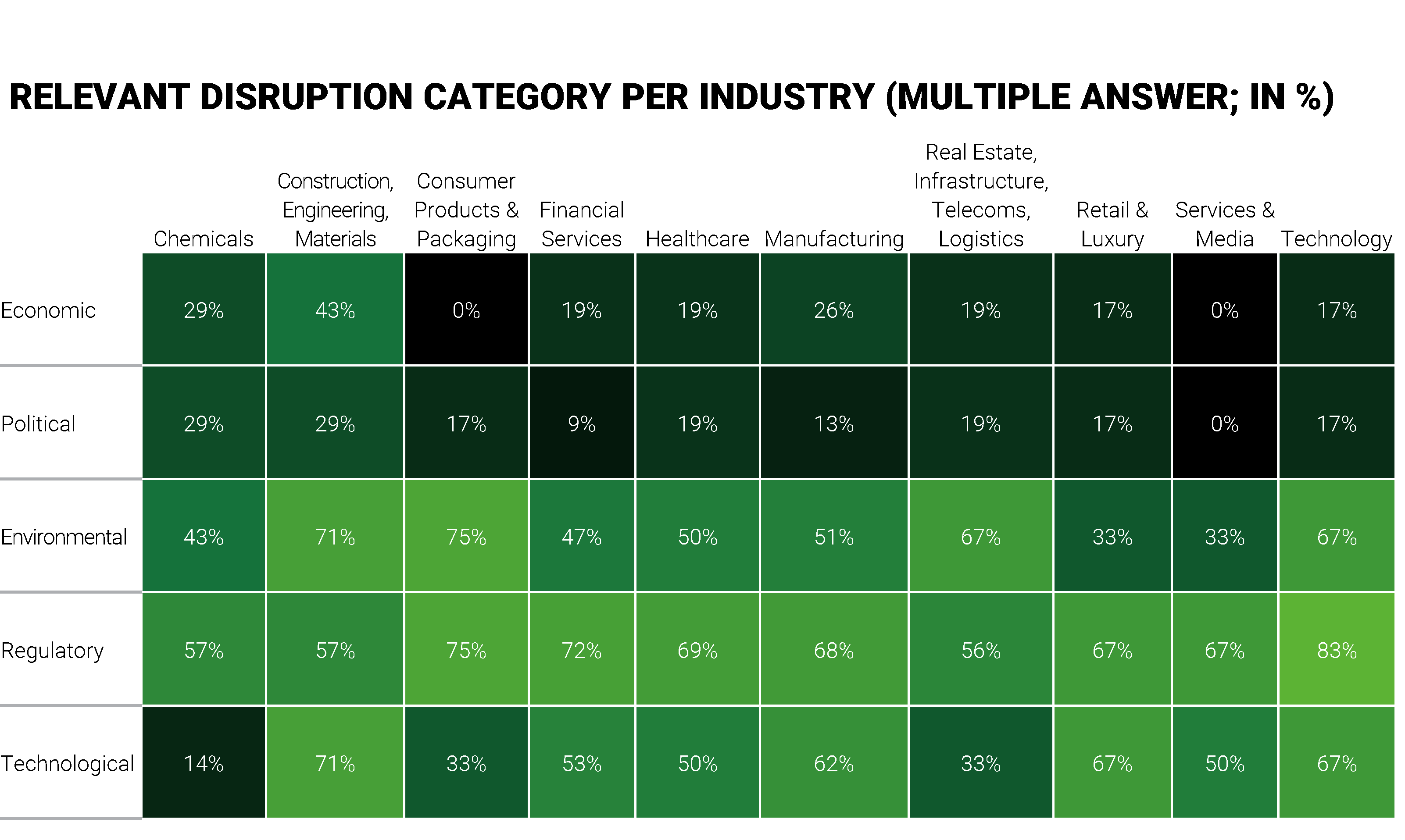 Disruption categories vary markedly across sectors. Regulatory disruption remains the only category relevant to more than 50% of companies in every sector. Other categories show pronounced sectoral variation.