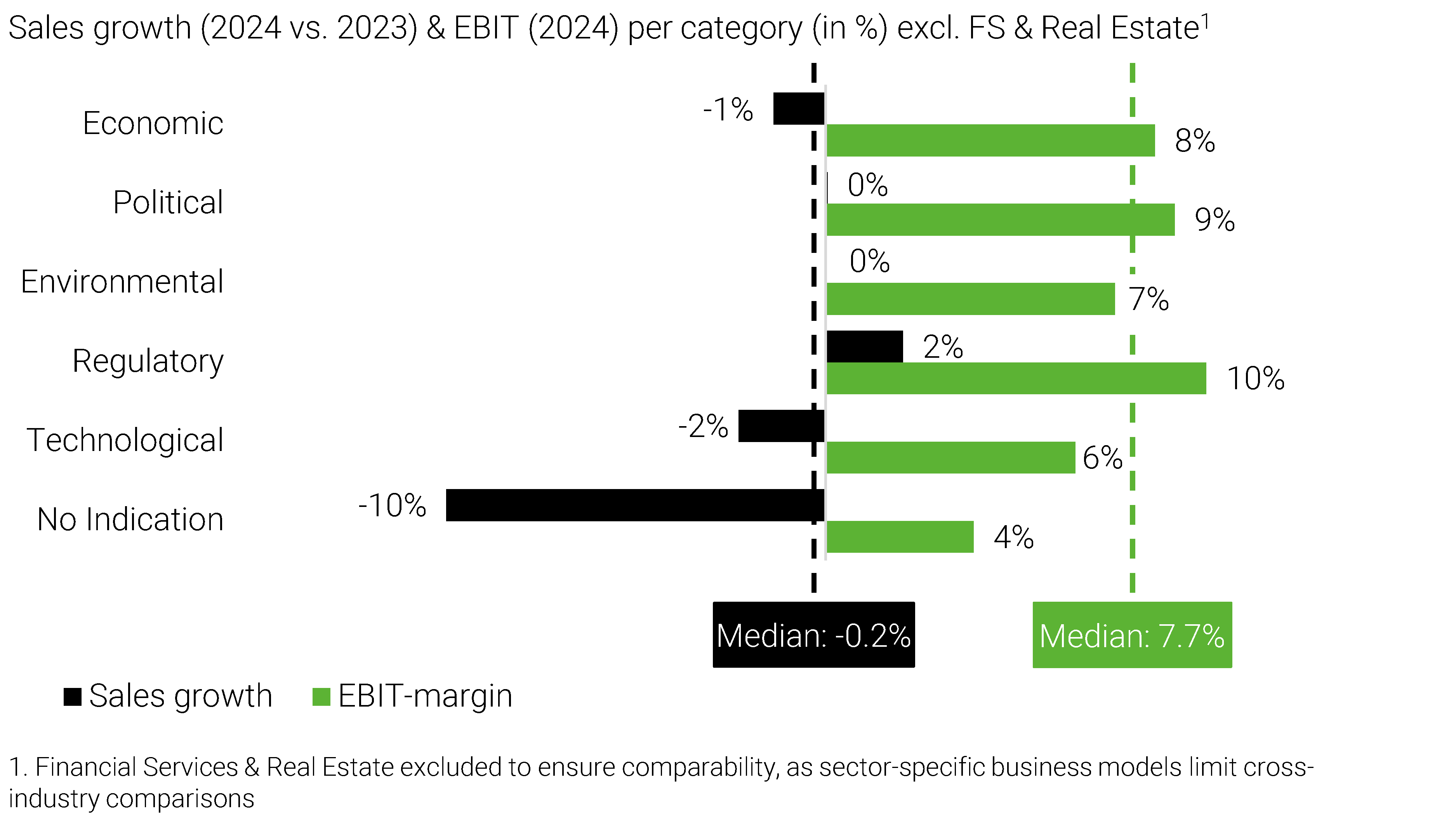 Data points to an “awareness premium” in performance: companies that explicitly identify – and hence manage – disruption, such as political or economic disruption, demonstrate stronger resilience in EBIT margins and revenue growth when compared to firms in the “No Indication” group. The latter cohort exhibits lower strategic agility and is more prone to reactive rather than proactive responses, suggesting that under-recognition of disruption may be a leading indicator of underperformance.