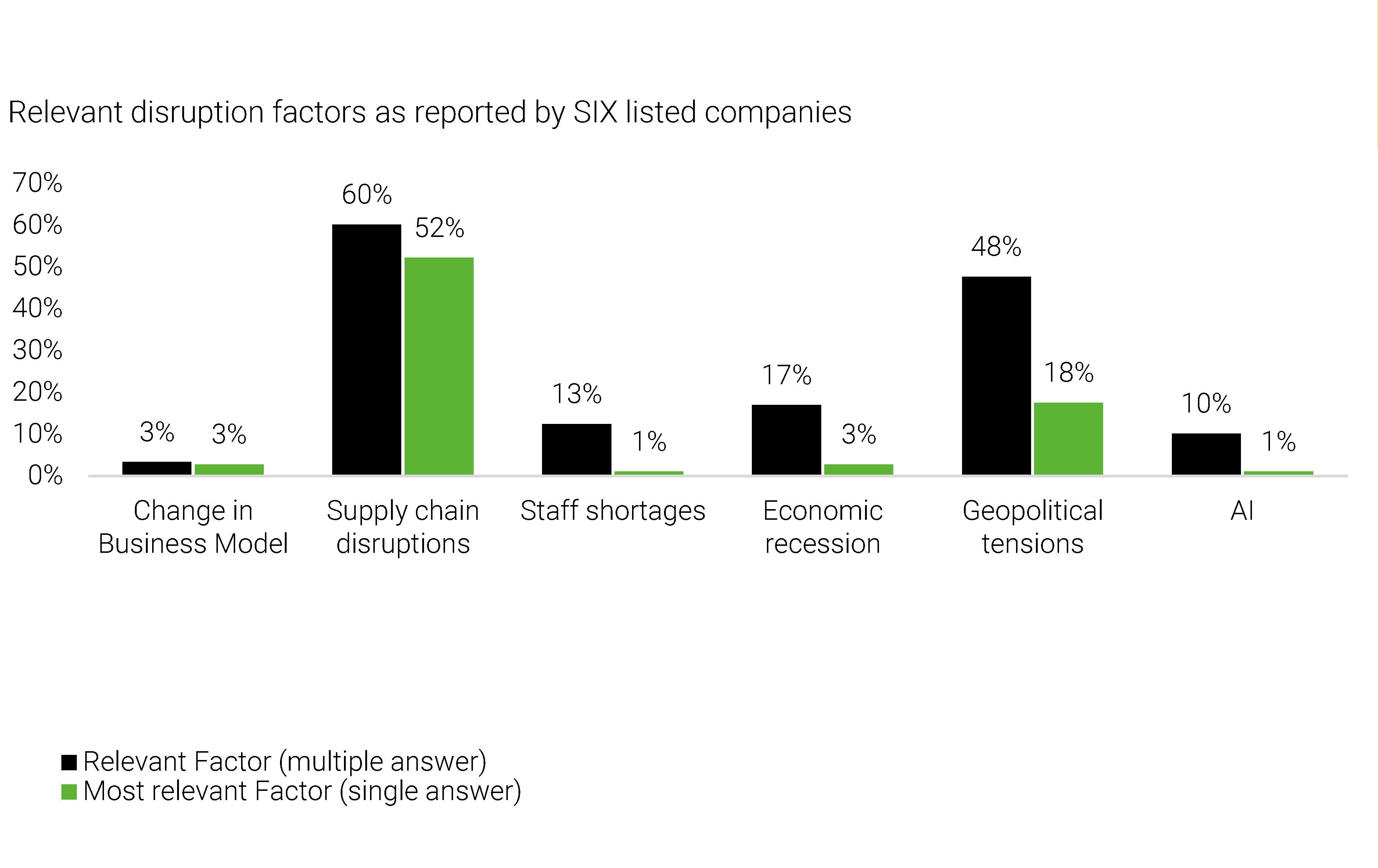Disruption has become a systemic condition for Swiss companies rather than an occasional event. Analyzing the annual reports and performance of SIX listed companies based on categories from the AlixPartners Disruption Index framework, regulatory disruption appears the most ubiquitous category, with 67% of companies (up from 59% in previous year) recognizing it as relevant, and 24% identifying it as their most critical disruption category (same as 24% in previous year). The rising complexity of compliance, spanning data privacy, ESG reporting, and sector-specific governance, is likely driving this prominence.