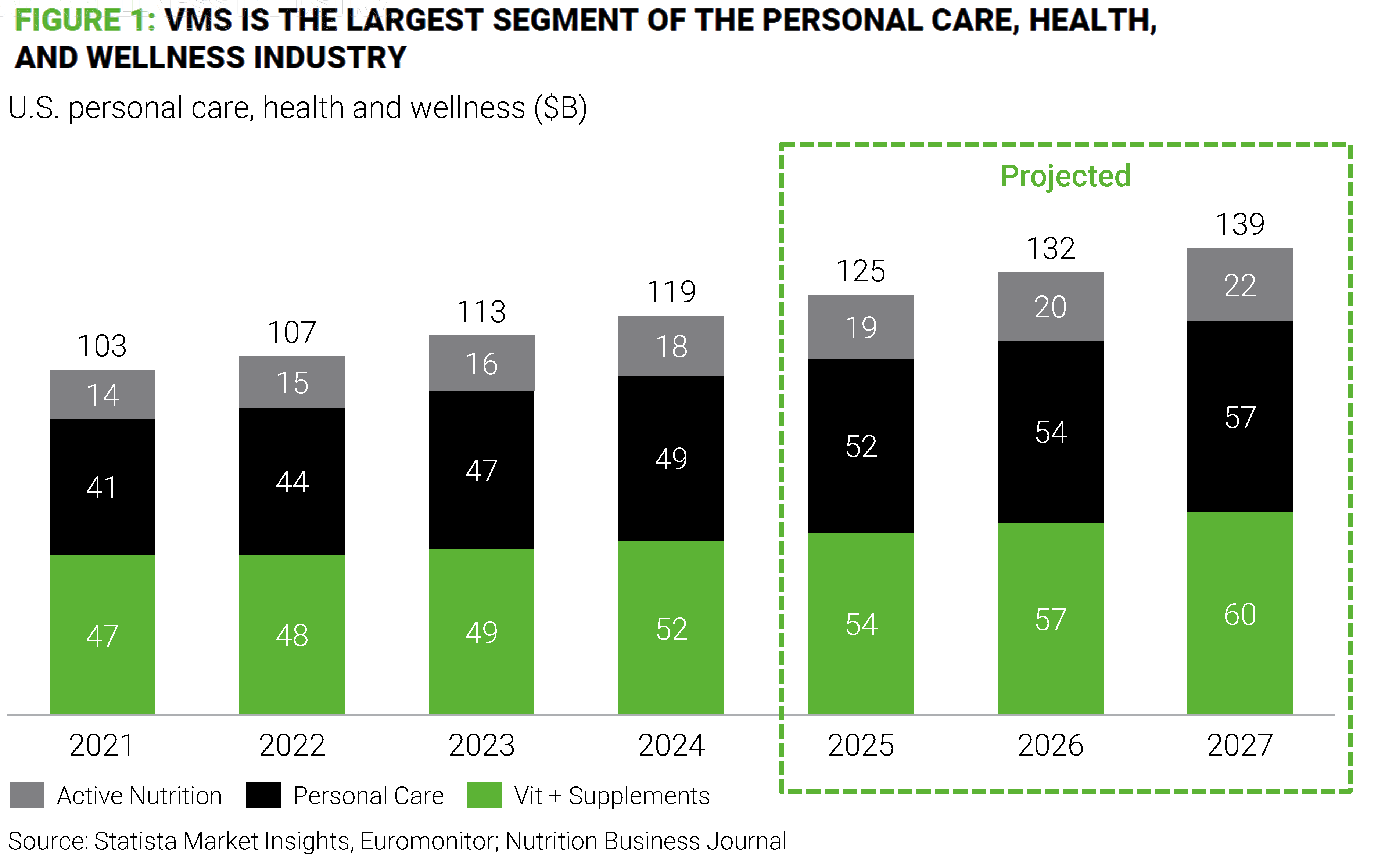 The U.S. VMS market topped $125 billion in 2025, per Euromonitor. The vitamins and supplements segment is projected to grow 11% through 2027. From changing diets to the rise of longevity programs/products, and a deterioration in access to healthcare, a host of conditions have combined to attack the old paradigm.