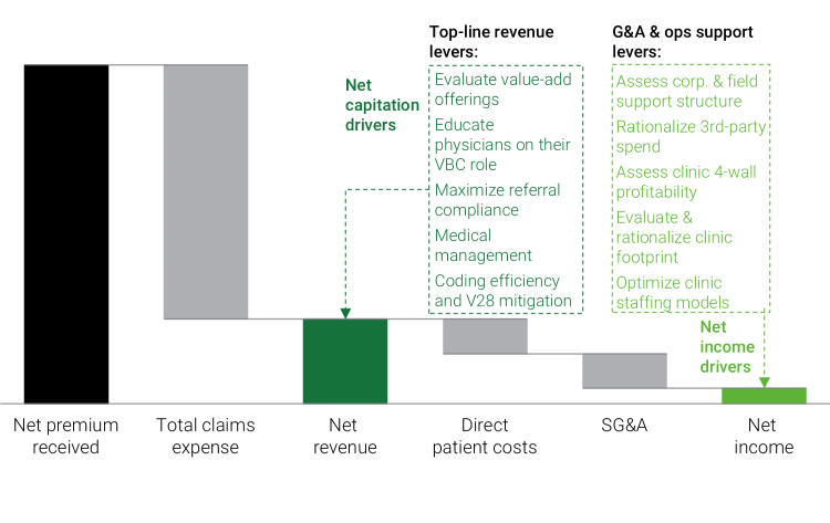 Providers need to evaluate their partial or full-risk models to understand how the revenue is attributed between the two and how deficits are calculated. Armed with the underlying economics, they build a sustainable revenue base. Strategic contract exits should also be considered if the arrangement's economic trajectory is unsustainable. This can pose organizational risk and should be planned with both patient impact and financial ramifications at the forefront of the decision process.