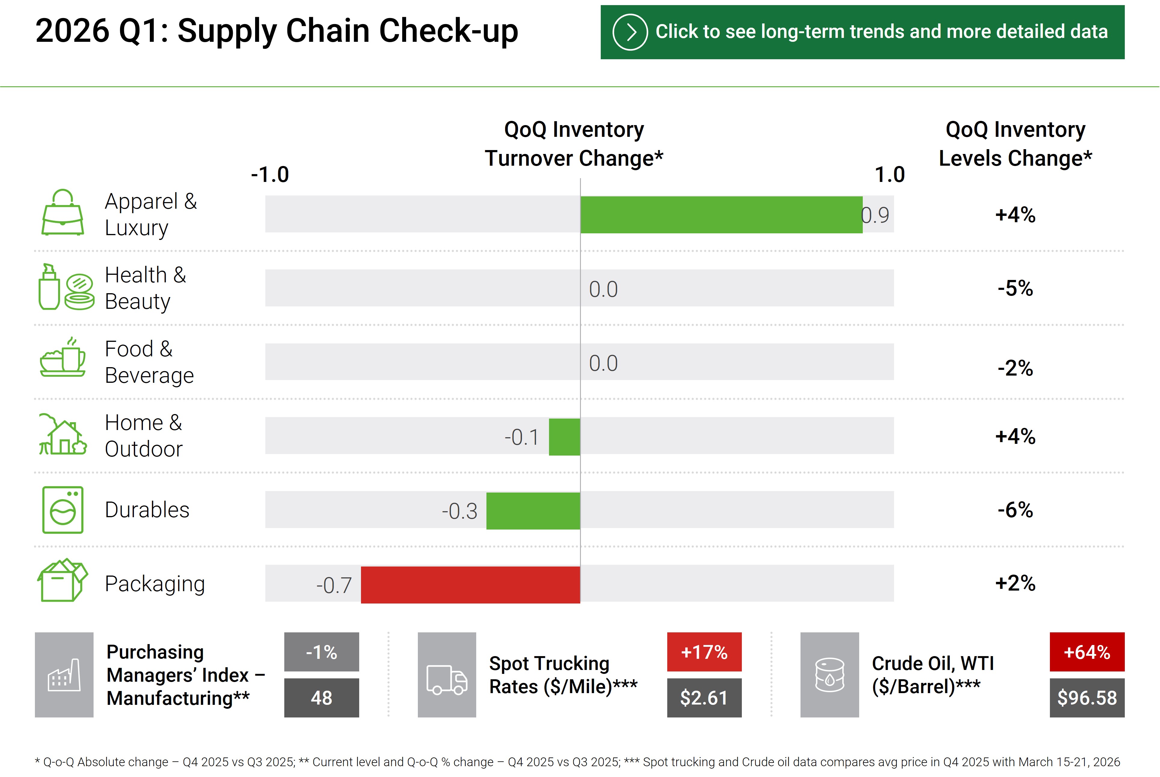 In the fourth quarter of 2025, inventory turnover experienced a notable increase in the apparel and luxury goods sectors compared to the third quarter, while declines home, outdoor, and durable products reflected a period of weaker sales. Inventory levels decreased across most industries, attributable to strong holiday season demand. After a modest rise in spot trucking rates last quarter, higher oil prices triggered by the U.S.-Iran conflict are set to significantly shift freight dynamics for CPG firms. Companies need to find innovative ways to manage increased costs and strengthen supply chains against price and supply disruptions.