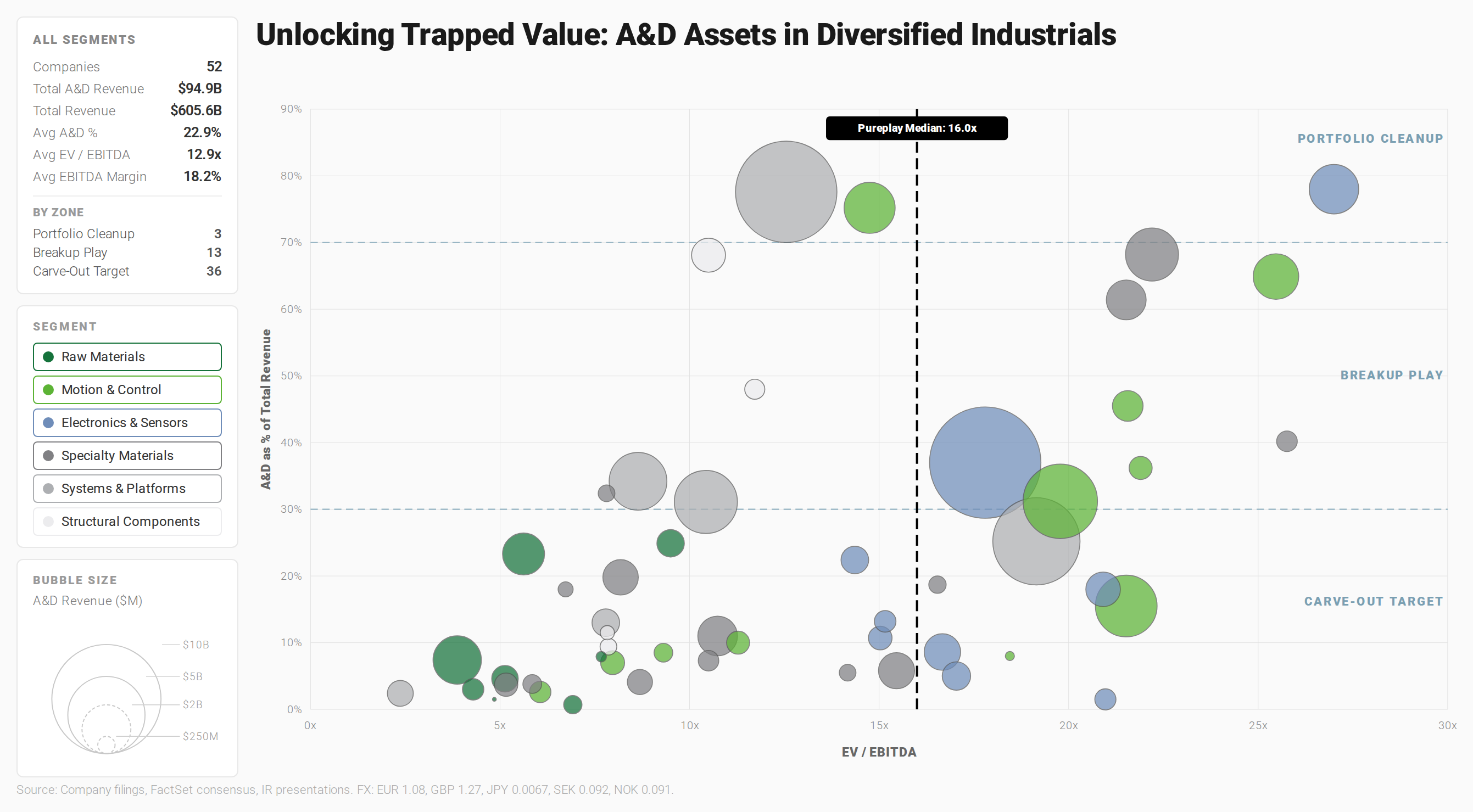 The carve-out target zone contains a significant number of companies—including Syensqo, SKF, and Eaton prior to the spinoff of its mobility unit. These are the hidden gems: A&D is non-core for a conglomerate, yet often sizable. When the whole company trades at a single-digit EBITDA multiple, the opportunity to create value is self-evident. In several cases, the A&D business alone is potentially worth more than the current enterprise value of the whole group.