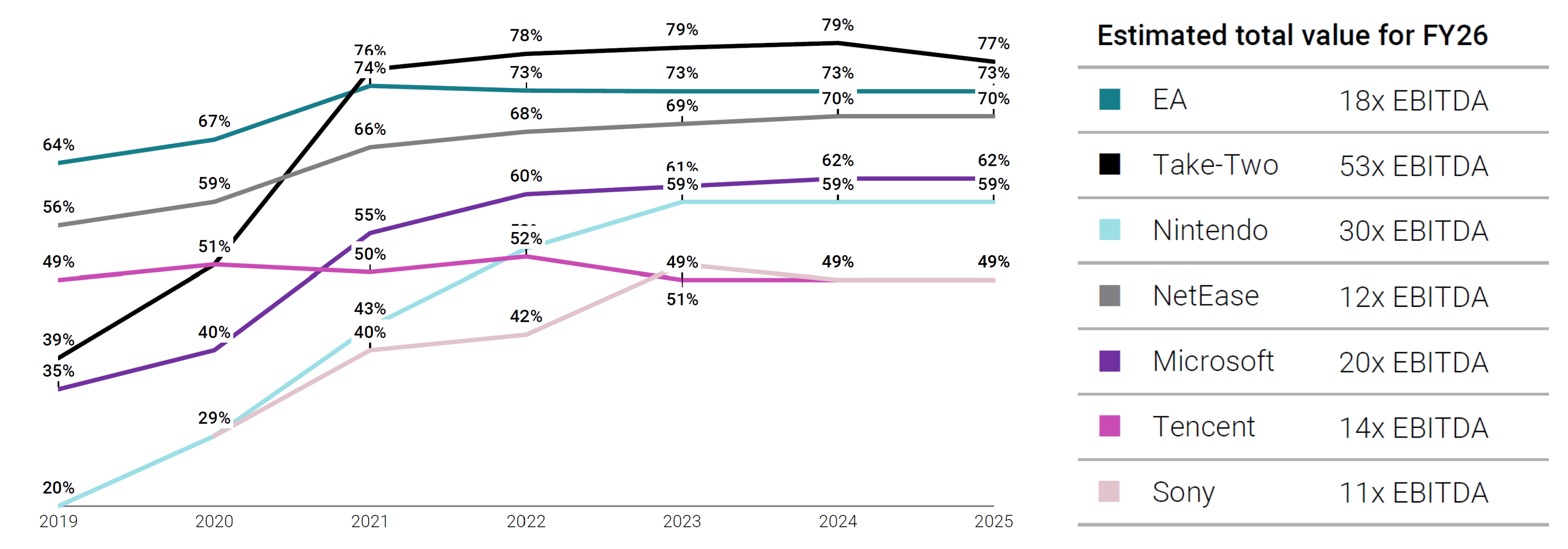 Major gaming publishers are increasingly valued for their ability to monetize IP through AI-enhanced engagement rather than franchise strength alone. Take-Two, for example, sees AI-driven systems in GTA Online generating billions in incremental lifetime value. Market data shows diversified publishers with live-service and AI capabilities trade at 13–15x forward EBITDA versus 8–10x for traditional studios. M&A activity reflects this focus, with capital flowing to high-performing, AI-enabled assets like Miniclip and Keywords Studios. AI deepens engagement, boosts recurring monetization, and is now a key factor in premium valuation, widening the gap between legacy content houses and AI-first publishers.