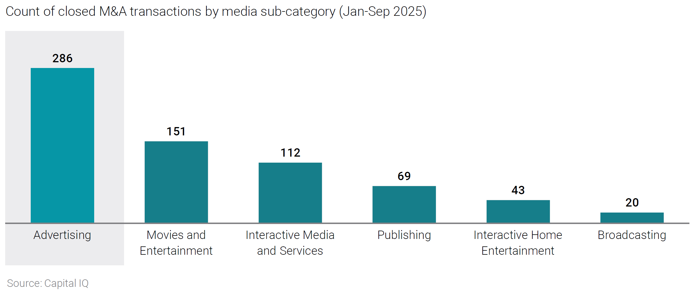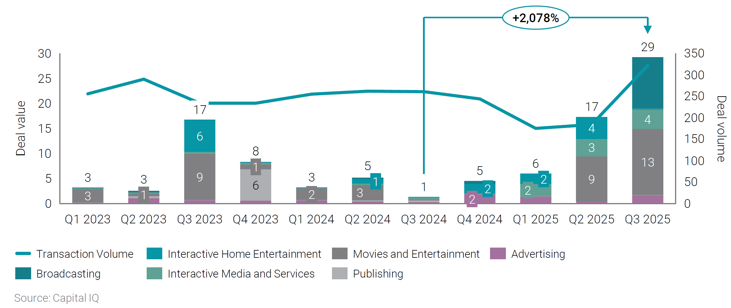 Despite a slow start to 2025, this prediction has proven accurate. In Q3 2025, we saw closed transaction value increase by more than 2,000% compared to Q3 2024, led by media holding company mega mergers and cable TV carve-outs.