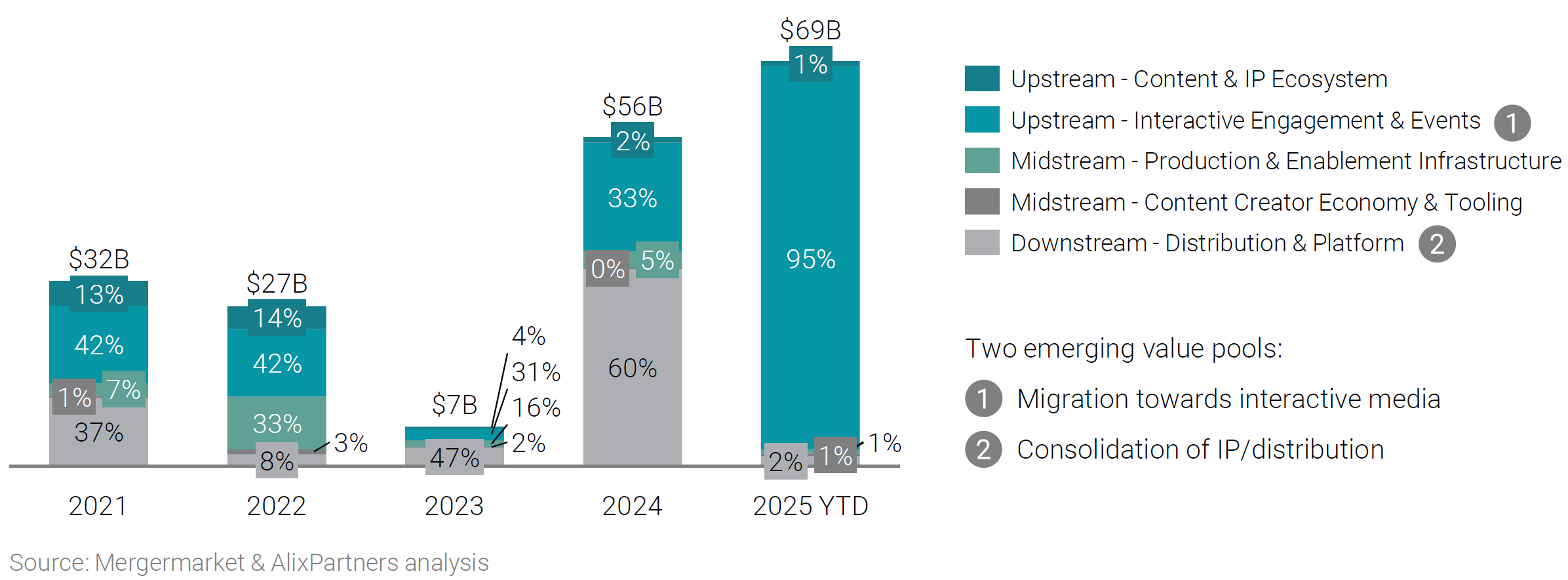 Private equity is concentrating on two key media value pools: interactive media and consolidated IP/distribution. Interactive ecosystems—encompassing gaming, live events, esports, and fan engagement—benefit from AI, real-time rendering, and automation, as well as data-driven, commerce-linked monetization. Deal values in these areas have surged 3–4x since 2021. Meanwhile, consolidation of IP and distribution by studios and aggregators, such as Disney-FOX and Warner Bros.-Discovery, raises entry costs but secures audience control. PE is increasingly focused on scalable infrastructure and tooling around these sectors, favoring strategic partnerships and co-financing over full-control acquisitions.