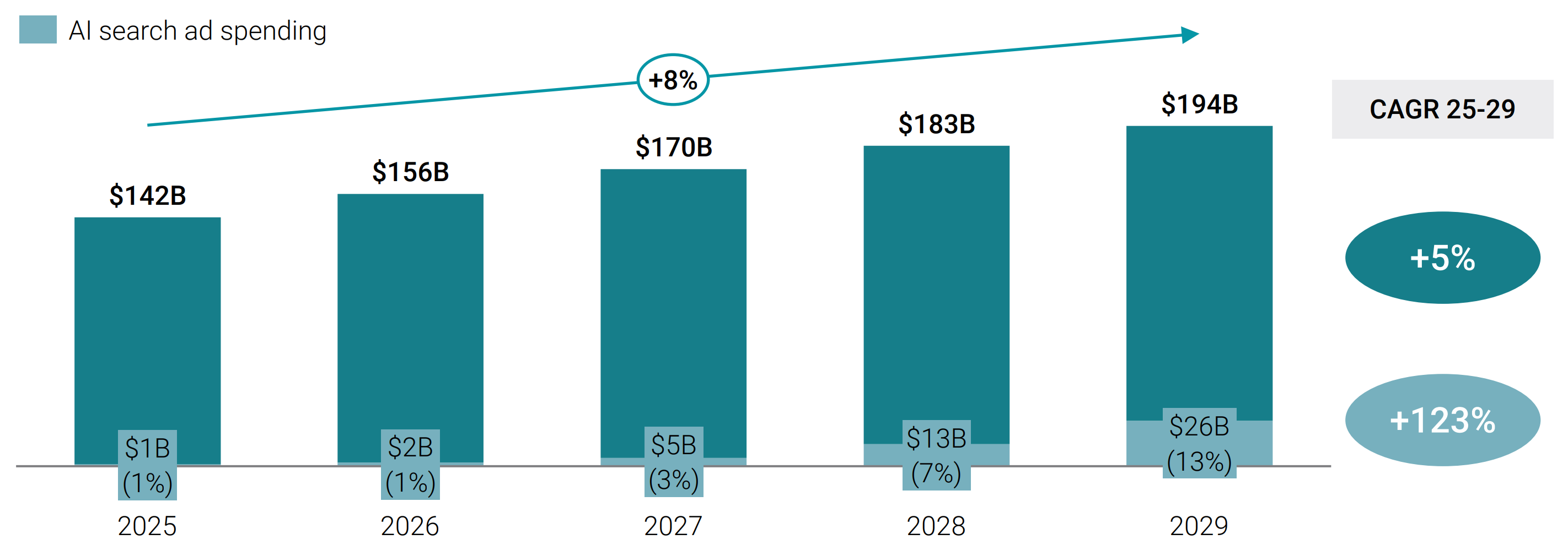 Generative AI is expanding search’s total addressable market (TAM) by an estimated $26 billion in the U.S. alone by 2029, creating new ad formats, new measurement models, and new monetization layers. In 2025, AI-driven advertising formats have already topped $1 billion in U.S. spend across Google’s AI Overviews (AIOs), ChatGPT, Microsoft Copilot, Amazon Rufus, and Perplexity—and growth is only accelerating.